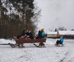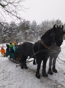 Dzieci miały okazję przejechać się saniami ciągniętymi przez konie oraz traktorem z przyczepą pełną śmiechu i radości . Po emocjonującej przejażdżce czekało na wszystkich ciepłe ognisko, a przy nim: